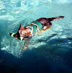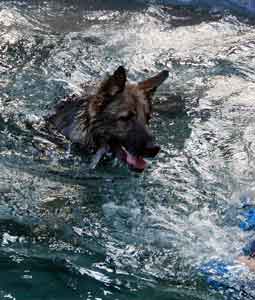 We are so very grateful for the support of Ric's sponsorship team without whom we could not provide all that he needs now and down the road to his full recovery....THANK YOU!! UPDATE 10/21: There's a tiny portion at the end of Ric's incision (it was extended during his 2nd surgery) that has not completely closed yet. As soon as it does, Cedric will begin his physical therapy which will include an under water treadmill. He is ambulating very well yet slightly favors his other forelimb for weight bearing. In fact, he really wants to run...soon, Ric, soon. Today he's getting his 1st post accident bath! We are confident that following his PT, he will regain full range of motion...stay tuned... UPDATE 10/22: Ric is now scheduled to begin his PT on November 3rd. UPDATE NOVEMBER 4th: Ric had his first AND LAST physical therapy session yesterday and did so well that he does not have to return for any additional PT! We have been given a number of at-home exercises to do with him to help break up scar tissue and increase extension with the affected forelimb. His injured forelimb is, understandably, only slightly weaker than his uninjured side, however, he is expected to have full range of motion relatively soon. He is now bearing full weight with no limp and despite being out of shape, handled the full length of the pool many times like a champ. Even better, he is back to his friendly loving hyperactive self; he let Jeff handle him (with kisses) and palpate the wound itself..an indication that he is no longer in pain. The challenge now is to keep him on a gradual return to full out running; the running part does not pose a problem..it's the sudden stops we have to avoid for now. Swimming was highly recommended so we're hoping that a nearby friend with a heated pool will let him have a few sessions. Cedric has actually regained the weight lost from being less active and looks great. A couple of visits to boot camp for a socialization refresher and Ric is ready to roll. Our THANKS to all who helped and cared...you are the BEST! The photos below; squatting to walk thru a tunnel, handling the cavaletti, swimming and retrieving the entire, length of the pool quite a few times and smiling the whole time: