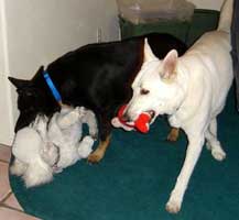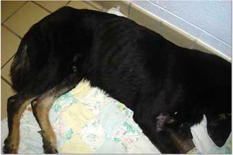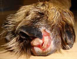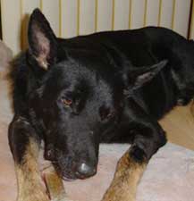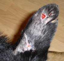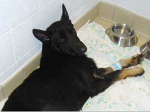 UH-OH...INFECTED PAW...BACK TO THE VET! (Notice there are no nails left at all...can't imagine how long he struggled) UPDATE 9/30: Based on his muscle wasted condition, we were not comfortable waiting until Heart could get to Phoenix to do the extensive blood panel that we typically do, so we asked Cyndi to take him in for a quick snap test for Erlichia (Tick Fever). Our suspicions were confirmed by a POSITIVE result, so poor Heart is now on 3 different antibiotics...treatment for his Tick Fever has begun. There could be other issues in the form of parasites as the water in the canals isn't usually disease free :-( His paw is badly infected and requires soaking and hot packs three times a day. He's also on pain and anti inflammatory medication; this boy is hurtin. In addition, we've found some puncture wounds throughout his body, particularly on his crusty ear. He might have been attacked, if not by another dog, by coyotes. He is scheduled to revisit the hospital on Wednesday. He has briefly met a male German Shepherd and a female Standard Poodle and was friendly and benign with both. Heart seems like a very sweet kid. When he's feeling better, he'll meet some cats, but not for a while. His bills are mounting...we've already paid the $300.00 for his initial hospital stay, not including meds, and we've only just begun. Your help is so very much appreciated and enables us to do whatever is necessary to get him back on his feet. THANK YOU!! UPDATE 10/2: Heart spent almost all of yesterday resting in Cyndi's kitchen. Obviously restless due to pain, he merely moved from spot to spot and stayed plopped down all day. He let's her do the hot pack treatments without protest but wants no part of soaking his paw; it's gotta be very painful. He will willingly allow some stuff and a stubborn "no" thanks" to others, but he IS taking all of his meds. He seems to be especially fond of men and thumps his tail when Dad gets home from work. He has also discovered the benefits of being indoors and will mournfully howl and whimper now if left outside for while. Heart can come to Phoenix as soon as a stay-at-home caretaker materializes. Any GSD lovin retired nurse types out there ? Several of Heart's wounds were initially overlooked until we bathed and cleaned him up, at which point several unattended flesh wounds became apparent. We really want to get him to our vet as soon as possible but we must have a safe haven for him first...the sooner the better. This wound will take quite a while to granulate over; trying to ward off infection is the primary task right now.
