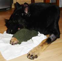 UPDATE 10/6: Heart paid the vet another visit on Wednesday and she pretty much told Cyndi to "keep doin whatcha doin...." Here's Cyndi's Friday report: "The swelling is much improved in his leg and she was pleased with the way his paw looked. He only gained 1 lb which surprised me because he is eating at least 3 meals a day along with nutritous treats. I leave dry food out for him. I ordered the Granulex. He had a good day today--spent lots of time outside relaxing (without stressing because he was outside away from me), caught him PLAYING! with Godiva...oh and he knocked over the garbage can and spread last nights leftover beans and weenies all over the kitchen floor.....I think he's starting to feel better :) " UPDATE 10/10: One of the punctures on Heart's ear goes through and through (to the other side) so it's going to take a while for the hole to close. The wounds on his paws are much like treating burns; there's no skin to protect them, so every time he tries to use his paws, they bleed. He's also losing most of what was left of his nails as well as the necrotic skin on his pads on his "good" paw. His leg above the hock is still swollen but his overall appearance and coat is much improved as his his disposition. We'll find out just how improved as he's about to meet the cats!