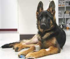 UPDATE: Our special Angel will be transferred to the orthopedic surgeon on Tuesday morning for a 2nd, hopefully leg-saving surgery in the afternoon. We're holding our breath..... UPDATE 5/6: Lady's surgery was scheduled for 3pm yesterday but as luck would have it, an emergency broken back took priority so her three-hour surgery concluded at 10:30PM last night. She tolerated the very extensive procedure well; the pin (the tip of which was making contact with her sciatic nerve) was removed as her bone had given way on one side. There were also bone fragments from the original injury removed from a pocket. She had also suffered considerable muscle damage along with two nerves that had to be reunited. She has a 6-screw plate and her surgeon is "hopeful." That said, there is always a chance of failure. Should that occur, he made it clear that there are no options other than amputation. Lady's post-op protocol will be challenging; she must use the leg in order to maintain and build the muscle she needs to save her leg; on the other hand, she cannot do anything that will jeopardize its' stability and well, she's a puppy. It will definitely be a balancing act for her caretakers. Job one is getting her to eat; her nutrition to date has been primarily intravenous, save for the boiled chicken Nicki brought her over the weekend. Her vet seems to think that her inappetence was pain related and expects a huge improvement by today...we'll see. She's gotta eat to heal. We wish to thank everyone for their support. We might have to hospitalize Lady for the next 10 days at a minimum of $500 per day, plus the surgeon, plus her ICU stay, plus meds and supplements; we're looking at close to $10,000 in expenses, so the need is still great. We will update Lady's progress as often as we can. THANKS and BLESS YOU! QUICK UPDATE MAY 6th: LADY IS DOING GREAT!: Surgeon wanted to keep her all day so our staff member Nicki picked Lady up at 7PM tonight and both are headed home...for now. Vet could not have been more pleased with how she is doing and how good her attitude is; despite all of the traumatic surgery, she is obviously in far less pain than she was....let's hope she is ready to chow down. UPDATE 5/7: After conferring at length with her surgeon, the concensus is that Lady needs to stay in Tucson with 24-hour watchful eyes. She's feeling so much better that it's already difficult to keep her as quiet as she needs to be. She will be in hospital boarding for 10 days, until her post-op vet visit on Monday. May 18th, as Nicki will be out of town next week. Here's Nicki's 1st night foster report: "Lordy, lordy, lordy. We now have a GSD puppy on our hands. One with zero training, or manners but what a personality! Lady came in here full of curiosity, no fear. I would be shocked if she has ever been in a car or a house. She has explored every inch of the house, many times. :) She was initially defensive with my boys, big shock. Hair up, lunging (quite a feat with a recently fixed fracture and wearing a lamp shade). Had her in the den in a crate while we "decompressed". Lady would bark if the boys came near the crate so they made themselves scarce. At bedtime we tried the X pen with a bed in it but she was having non of that. She decided that she could crawl out over the top. So the crate came into the bedroom. She was a bit vocal at first but settled in. At about 1am I took her out and she urinated. Yeaaaaa. Back in the crate, a bit of whining and barking then back to sleep. She stayed quiet until we got up @ 5:30. Urinated again, barked and lunged at the boys again then decided that they are OK. She really wants to run and play and jump and frisk around. So sorry miss, still on leash. I do take the e-collar off when she is out of the crate and she absolutely has to have it, she really wants to chew her incision. There's almost no swelling, there is NO redness, no drainage, it looks great. Long discussion with Dr. Warfield and the consensus is that she should stay at Pima while we are gone. He feels that cage rest for the first 10-14 days could only be beneficial to her. I will find out today what the charges will be. The surgery site looks great, the post surgery x-rays while horrific in one sense, are a complete marvel in another. TK did an amazing job putting this baby back together again. As far as recovery goes, well that is not completely clear. Lots depends on her. TK thinks that the first 3 weeks are the critical weeks. She must have leash/crate restrictions the entire time. Any type of slip or blow the area could cause the plate to fail. He feels that complete bone recovery is going to be at least 12 weeks and longer to build the muscle. Water therapy would greatly enhance full muscle and range of motion. And of course, there is always the temperament issue. TK fully understands the need to socialize this girl and feels as long as it is under supervised conditions, it would be fine. I am taking her to work with me today and at some point I will get some new pictures" UPDATE 5/13: We've been checking on our gal daily while she is being nurtured and monitored on a 24 hour basis by our friends at Pima Pet Clinic; she's doing very well. She did drain a copious amount of fluid several days ago, which we were told to expect, and that was the end of any drainage from her incision. She is able to toe touch and squat, something she couldn't do before and does not appear to be in much pain. Lady is, after all, an untrained puppy so she can be a handful and does not take kindly to confinement, however, her techs say that she has the routine down pat and she lets everyone know when her afternoon walk time arrives. She's eating like a little pony. We are very eager to see what her surgeon has to say on Monday when Lady has her first post-op visit and next update. Her Tucson foster Mom will return from her trip and hopefully take her back home for the weekend. UPDATE 5/18: We are devastated; Lady's repair failed despite he