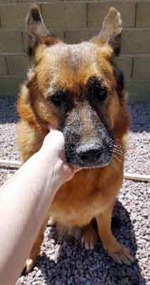 Bella appears to be a plush coated female out of, primarily, West German show lines. We have estimated her age at 9 years, however, dogs that have had a rough life can appear older than they are and vice versa. Her ears show signs of having been fly bitten..an indication of being outside unattended at some point. She has a good size growth on her rear paw and we think her eyes need attention as well. Her arthritis could just be age related and exacerbated by lack of low impact exercise. Bella's Mom is struggling and not able to provide the veterinary care we think she needs. We are willing to provide that care once we have physical possession of her but that means Bella must have a foster home asap. Mom is also concerned about the discord between the two dogs and the potential for injury. An only dog, I'm the Queen Bee situtation with someone home a lot would be ideal. We desperately would like to see this senior experience her Golden Years surrounded by the time and attention she so deserves. Bella J is spayed, vaccinated, micro-chipped, crate and house trained. UPDATE MAY 2nd: While we have not yet found a foster home for Bella J, we simply can't stand the thought that nothing is being done for her in terms of her health. so we are getting her to our vet for a thorough exam and some comprehensive blood work... for starters. If there is nothing going on systemically, then we will consider surgery to address the growth on her foot but we have to know if she is healthy enough to withstand that surgery. Her initial appointment is scheduled for Friday, May 6th. UPDATE: Bella had a full exam, blood draw for her labs and eye exam with stain today. We should have the results of all of her tests by Monday or Tuesday. She weighed in at a surprising 80lbs. Aside from saying no to a blood draw from the neck, she was tolerant and passive.