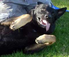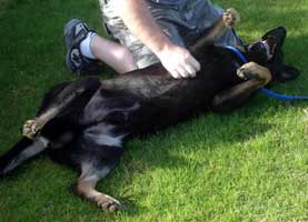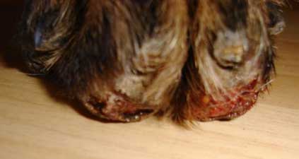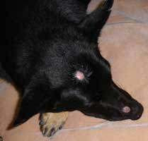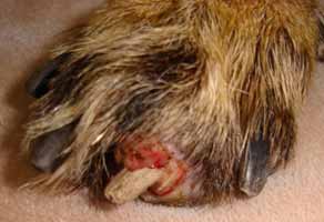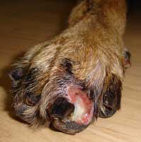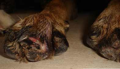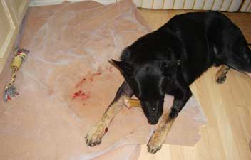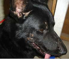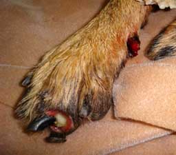 UH-OH...INFECTED PAW...BACK TO THE VET! (Notice there are no nails left at all...can't imagine how long he struggled) UPDATE 9/30: Based on his muscle wasted condition, we were not comfortable waiting until Heart could get to Phoenix to do the extensive blood panel that we typically do, so we asked Cyndi to take him in for a quick snap test for Erlichia (Tick Fever). Our suspicions were confirmed by a POSITIVE result, so poor Heart is now on 3 different antibiotics...treatment for his Tick Fever has begun. There could be other issues in the form of parasites as the water in the canals isn't usually disease free :-( His paw is badly infected and requires soaking and hot packs three times a day. He's also on pain and anti inflammatory medication; this boy is hurtin. In addition, we've found some puncture wounds throughout his body, particularly on his crusty ear. He might have been attacked, if not by another dog, by coyotes. He is scheduled to revisit the hospital on Wednesday. He has briefly met a male German Shepherd and a female Standard Poodle and was friendly and benign with both. Heart seems like a very sweet kid. When he's feeling better, he'll meet some cats, but not for a while. His bills are mounting...we've already paid the $300.00 for his initial hospital stay, not including meds, and we've only just begun. Your help is so very much appreciated and enables us to do whatever is necessary to get him back on his feet. THANK YOU!! UPDATE 10/2: Heart spent almost all of yesterday resting in Cyndi's kitchen. Obviously restless due to pain, he merely moved from spot to spot and stayed plopped down all day. He let's her do the hot pack treatments without protest but wants no part of soaking his paw; it's gotta be very painful. He will willingly allow some stuff and a stubborn "no" thanks" to others, but he IS taking all of his meds. He seems to be especially fond of men and thumps his tail when Dad gets home from work. He has also discovered the benefits of being indoors and will mournfully howl and whimper now if left outside for while. Heart can come to Phoenix as soon as a stay-at-home caretaker materializes. Any GSD lovin retired nurse types out there ? Several of Heart's wounds were initially overlooked until we bathed and cleaned him up, at which point several unattended flesh wounds became apparent. We really want to get him to our vet as soon as possible but we must have a safe haven for him first...the sooner the better. This wound will take quite a while to granulate over; trying to ward off infection is the primary task right now.