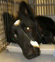 P.M.VET REPORT FROM TUCSON We found a different Distemper test to send in, it has Distemper and 6 other upper respiratory diseases. We sent in Cocci/Ehrlichia, the URI panel (transtracheal wash material, eye swab, tonsil swab, blood, urine and feces). Al is in isolation, in a small crate due to the nasal oxygen. He is on fluids, IV antibiotics, IV vitamins. His chest films are horrible - bilateral pneumonia, he has a near constant stream of green mucous from his nose, is nothing but bones, he lost 10 pounds in 5 days. Al is at least 25 pounds underweight. BUT, he will head butt you and put his great big head under your arm and in your lap, his long plumed tail slowly wagging. His eyes are so sad and yet so alert.
