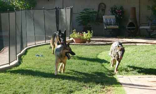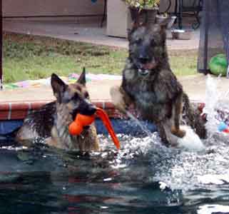 After settling in with his new pack and foster, and his medical work-up, he will begin basic obedience class. He clearly has not had any basic training at all, has just learned to sit as well as "leave it", and we're already working on heel as weather permits. UPDATE 5/31: By day 2 Ric was swimming without a vest, jumping in from the side of the pool, and found his way right to the steps. Talk about a quick study! His vet visit is scheduled for June 7th. Once again, Cedric is a working dog; he is not a good choice for a first time GSD owner or a novice handler. He will not be placed with very young children, particularly toddlers. He is also too active for a home in which no one is home all day. Thanks :-) UPDATE 6/8: Ric had his vet visit this week; a full physical exam, complete blood panel and fecal check both in-house and sent to lab. The results of all were excellent. He was negative for Tick & Valley Fever and no parasites seen. He is now a full time indoor guy, left loose at night without incident. We are awaiting the schedule from his trainer. Once his basic training has been completed he will be ready to roll. UPDATE JUNE 22: Ric has had his 2nd basic obedience class and is progressing well. Since no one has ever really taught him much, he has what we call, a "puppy brain". Things that require impulse control such as down & stay take time and consistency to master.