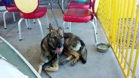 UPDATE MAY 21st: Here's today's foster report followed by photos of Ric's Saturday travels: "Hi Steff- Have I mentioned exactly how much we love this boy....? And I do mean "we", Jim is quite enamored by him too ;-) I took him in town this morning to walk with a friend of mine and her two poodles (female). We walked on a city maintained trail that gets a lot of usage, especially on the weekend. We met/passed numerous dogs, joggers, bikers, etc. and Ric is good with it all. After the hike we went back to her place to drop her dogs off before going to breakfast. When there, Ric met the "large and in charge" feline of the house. Although Ric was on leash, he wasn't all that excited about her. He first looked at the cat and said....ok, just another furry thing....and proceeded to take a drink of water from a bowl that was about two feet from the cat. Then he eased over to sniff the cat. He was curious and had the wide swooping tail action going on. Once he got real close, the cat gave him a "thump" on the nose (without claws). He jerked back a bit and said ok....then drank some more water. He was still a little curious about the cat but wasn't excited about the situation. We went to a diner for breakfast. They have a patio that they allow people to bring dogs onto. He met lots of people and was well behaved the whole time. Here are some phone photos from today's adventure..."