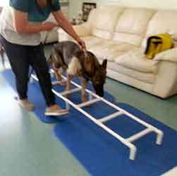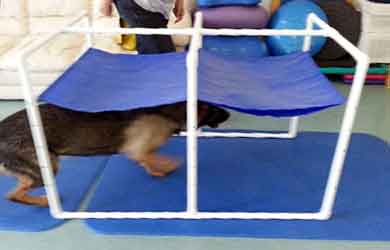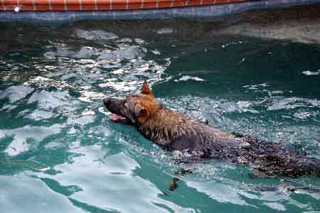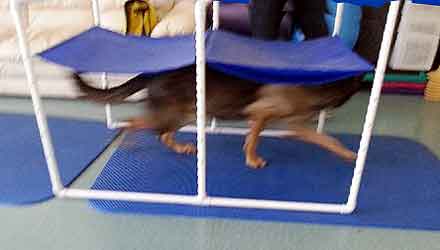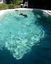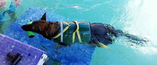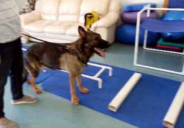 We are so very grateful for the support of Ric's sponsorship team without whom we could not provide all that he needs now and down the road to his full recovery....THANK YOU!! UPDATE 10/21: There's a tiny portion at the end of Ric's incision (it was extended during his 2nd surgery) that has not completely closed yet. As soon as it does, Cedric will begin his physical therapy which will include an under water treadmill. He is ambulating very well yet slightly favors his other forelimb for weight bearing. In fact, he really wants to run...soon, Ric, soon. Today he's getting his 1st post accident bath! We are confident that following his PT, he will regain full range of motion...stay tuned... UPDATE 10/22: Ric is now scheduled to begin his PT on November 3rd. UPDATE NOVEMBER 4th: Ric had his first AND LAST physical therapy session yesterday and did so well that he does not have to return for any additional PT! We have been given a number of at-home exercises to do with him to help break up scar tissue and increase extension with the affected forelimb. His injured forelimb is, understandably, only slightly weaker than his uninjured side, however, he is expected to have full range of motion relatively soon. He is now bearing full weight with no limp and despite being out of shape, handled the full length of the pool many times like a champ. Even better, he is back to his friendly loving hyperactive self; he let Jeff handle him (with kisses) and palpate the wound itself..an indication that he is no longer in pain. The challenge now is to keep him on a gradual return to full out running; the running part does not pose a problem..it's the sudden stops we have to avoid for now. Swimming was highly recommended so we're hoping that a nearby friend with a heated pool will let him have a few sessions. Cedric has actually regained the weight lost from being less active and looks great. A couple of visits to boot camp for a socialization refresher and Ric is ready to roll. Our THANKS to all who helped and cared...you are the BEST! The photos below; squatting to walk thru a tunnel, handling the cavaletti, swimming and retrieving the entire, length of the pool quite a few times and smiling the whole time: