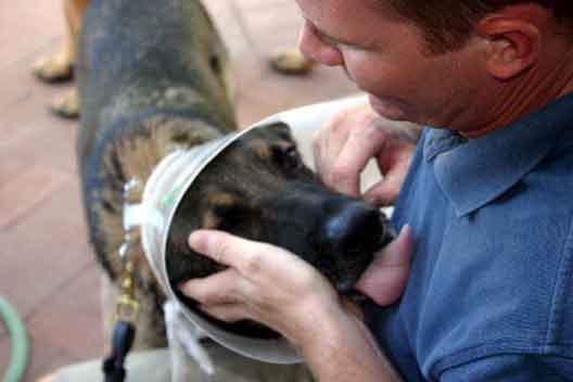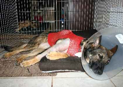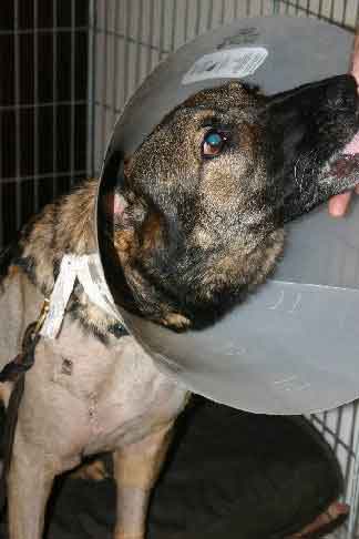 OCTOBER 6th: Our boy had his drain removed yesterday, this time with a shorter acting anesthesia from which he recovered faster yet pretty much slept for the remainder of the day. The incision is clean and swelling is down. The small wound from his drain looks a little funky and is being watched closely for infection. He had finally reached the point at which he let Darlene handle him and touch his body so we were worried that he would take many steps backward from a psychological standpoint. But today the procedure appears not to have had any negative impact on his behavior. Next week he will have one more "assault" in the operating room to remove his staples. UPDATE OCTOBER 14th: The staples are out and Ric is moving about. For now, he only has a slight limp but does register a big "ouch" if he moves the wrong way. Of course he will not be happy until the cone is off his head for good at which point we will have to slow him down. We have a call into his surgeon to see just how much we should let him do (she was off for his last vet trip) and will post what we learn. He has lost quite a bit of weight throughout his ordeal but will enjoy pigging out while catching up