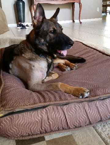 UPDATE JULY 27th: Ric completed his basic obedience course a couple of weeks ago and progressed as expected. He will be making a trip with all of his canine friends to his foster Mom's home up North soon to take a break from the heat. When he returns he will have 2 or 3 refresher classes after which he will be ready for forever. We've learned a lot from living with him in a home setting; while he started out as a working dog for the border patrol, he really is not all that over the top drivey; he IS however, very active and, again, likes to be very busy...he's no couch potato. It's a safe bet he will be even more so when the weather is cool. In essence, he does not need to have a job, per se, but must have a home in which his need for doing something is met. Other than that, he's somewhat of a mush pot, very affectionate and aside from his toys, craves human attention. Cedric is a balanced boy, calm in the house...a real sweetheart. Please check back for photos of his new experience playing in the woods. NO FUN IN THE WOODS UPDATE September: Ric was up north at his foster Mom's summer home and annual family reunion. Got a call Friday at about 4:30p...Cedric was running and tried to jump over a log...became impaled on it by a protruding limb. He had just under 3 hours of surgery Friday and spent the night at the emergency vet. Wound, muscle damage significant...his muscles were sewn back together..lots of debris. At this time there does not seem to be any orthopedic or arterial damage. Due to pain control issues, he will not let anyone near him other than "his own people" We will not know what, if any, residual deficits there might be with respect to function until after he's healed. Right now, given the nature of his wound(s) the risk of infection is high and for which he is being closely monitored. As of Saturday afternoon, he was back at the house resting comfortably in his crate on lots of medications. Cedric will be stopping at the hospital on the way home Monday or Tuesday for a wound check and to remove the drains. His recovery will take many weeks...we will know more once he's back in town. Should it become necessary after healing, we will be taking him for rehab with Jeff Flocker, of Canine Rehabilitation of the Southwest to ensure he regains full range of motion of the affected area. If you would like and are able to help with Cedric's medical needs, please click on the PayPal button below or visit: HOW TO DONATE UPDATE SEPTEMBER 30th: Cedric and our staff have, literally, been in crisis for the past week. Following his return home, he was so fractious that he ripped open his sutures requiring a second emergency surgery and redo of his pectoral muscle repair, an incision revision, and insertion of a new and different type of drain which is hidden & wrapped on his neck. The greatest challenge has been pain and fear which has kept him in defense drive..an Iinstictive state in which he feels his very survival is at stake, resulting in defensive aggression. Needless to say, this requires full anesthesia in order to handle him for `any procedure. Clearly, his pain tolerance is low thus he is heavily medicated. Even sedated, he will not let anyone near his body. Having to wear his E-collar at all times really upsets him but is an absolute must in order to protect the surgical site. The photo below shows that, following his 2nd surgery, the hospital left the drain tubing exposed in such a way as to make it very easy for Cedric to put his leg (or mouth) thru and rip it out; he had already pulled his original drain out up in Payson. We said, "no way" and back he went to the O.R. (and a 3rd general anesthesia) to secure the hosing.