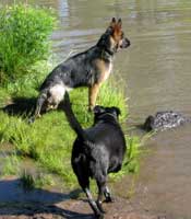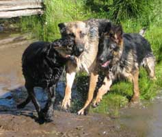 UPDATE 8/14: In addition to swimming and as part of her rehab, Lady has had regular chiropractic and acupuncture treatments. This past week she started on a new cold laser therapy for which one of her vets was recently certified. Both her foster Mom and the vet don't think Lady is ambulating the way most tripods do; she seems to be moving all of her weight to the rear. As a result, her gait is off and she is not building the shoulder and leg muscle she needs. We will likely do X-rays of her elbows but will first bring her to Phoenix to confer with our friends at Canine Physical Rehabilitation of the Southwest for an evaluation and recommendations. Otherwise, "Ali" is making up for lost puppy time and getting into as much trouble as she can along with doing her best to annoy her canine roommates...playing does not seem to be one of her challenges :-) |