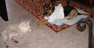 Other wise, he's doing great...he's up to nearly five hours left alone, loose in the house and no problems; he's been a model citizen.