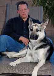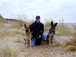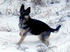 | In 1999, Gene & Betsy Hackman were visiting the football stadium in Baltimore; they had their two GSDs with them. When a staff member at the field saw that they were German Shepherd folks, she told them about a stray that had been wandering about the field.  "Duke" flew home with the Hackmans and after some "polishing" became Gene's number one buddy.  In 2005, now down to just Duke, they added "Maisie" with whom Duke quickly bonded and constantly frolicked. Duke left for the bridge on July 4, 2007.