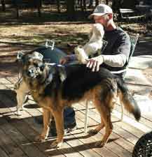 MOST OF THE TIME AND KNEW HOW TO TEND TO HIS MEDICAL NEEDS. AS LONG AS LOGAN HAD HIS PACK, HE SHOWED NO ANXIETY WHATSOEVER. HE HAD HIS VERY OWN BED & SPOT IN HIS FOSTER MOM'S BEDROOM AND HIS PERSONAL PLACE OUTSIDE